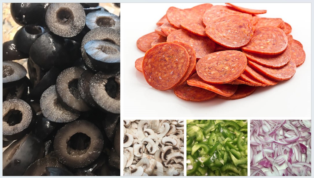 Normally we use, pepperoni, red onion, bell pepper, mushroom, olive as topping for our pizza.