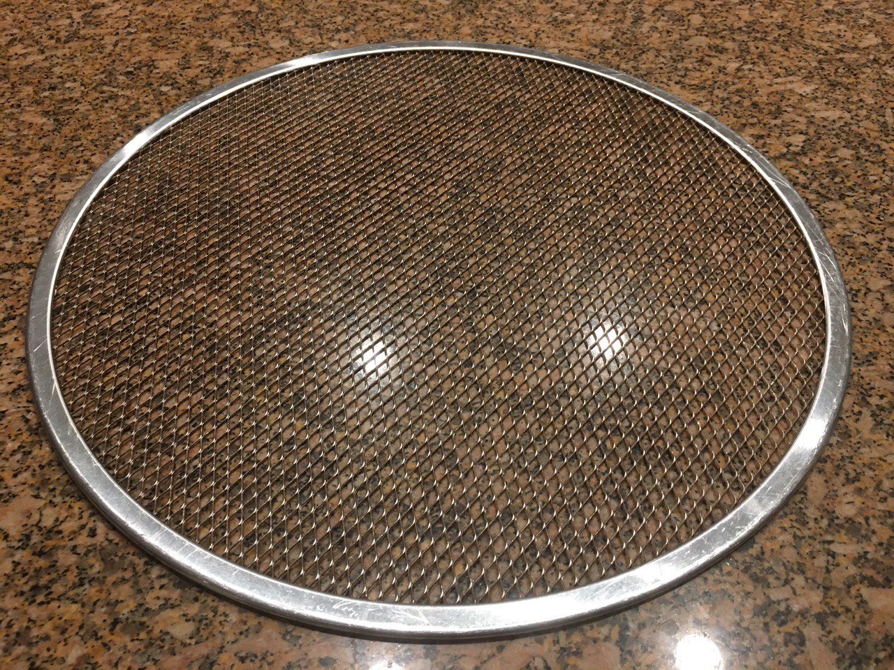 screen for baking pizza. Pizza screen is made of thin, perforated metal.