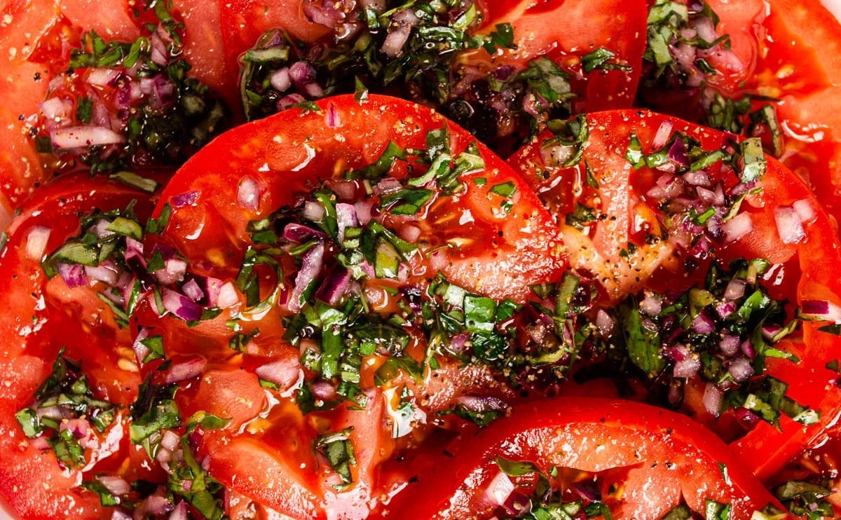 Fresh sliced tomatoes dressed simply with olive oil, balsamic vinegar, salt, and sometimes onions, garlic, or herbs like basil or oregano.