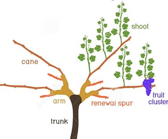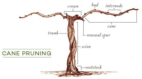 Cane pruning is usually implemented with head training which means that canes originate from just below where the vertical trunk meets the fruiting wire.