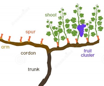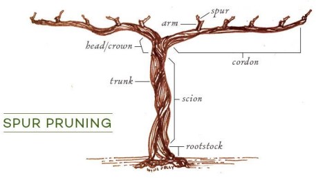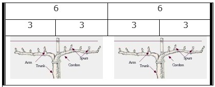 Spur pruning is generally associated with pruning and retaining two to four buds on one year old wood that originates across the length of the fruiting cordon.